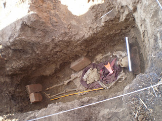 Es en un campo de maiz, bajo en plástico negro con cuatro palos hay dos mèdicos forenses cada uno en una fosa limpiando los huesos de una señora y de un catequista de 28 años. Así lo confirmaron sus familiares. Hay abiertas cuatro fosas, pero olo han encontrado tres esqueletos. La supervisora es Sílvia una antropóloga argentina.